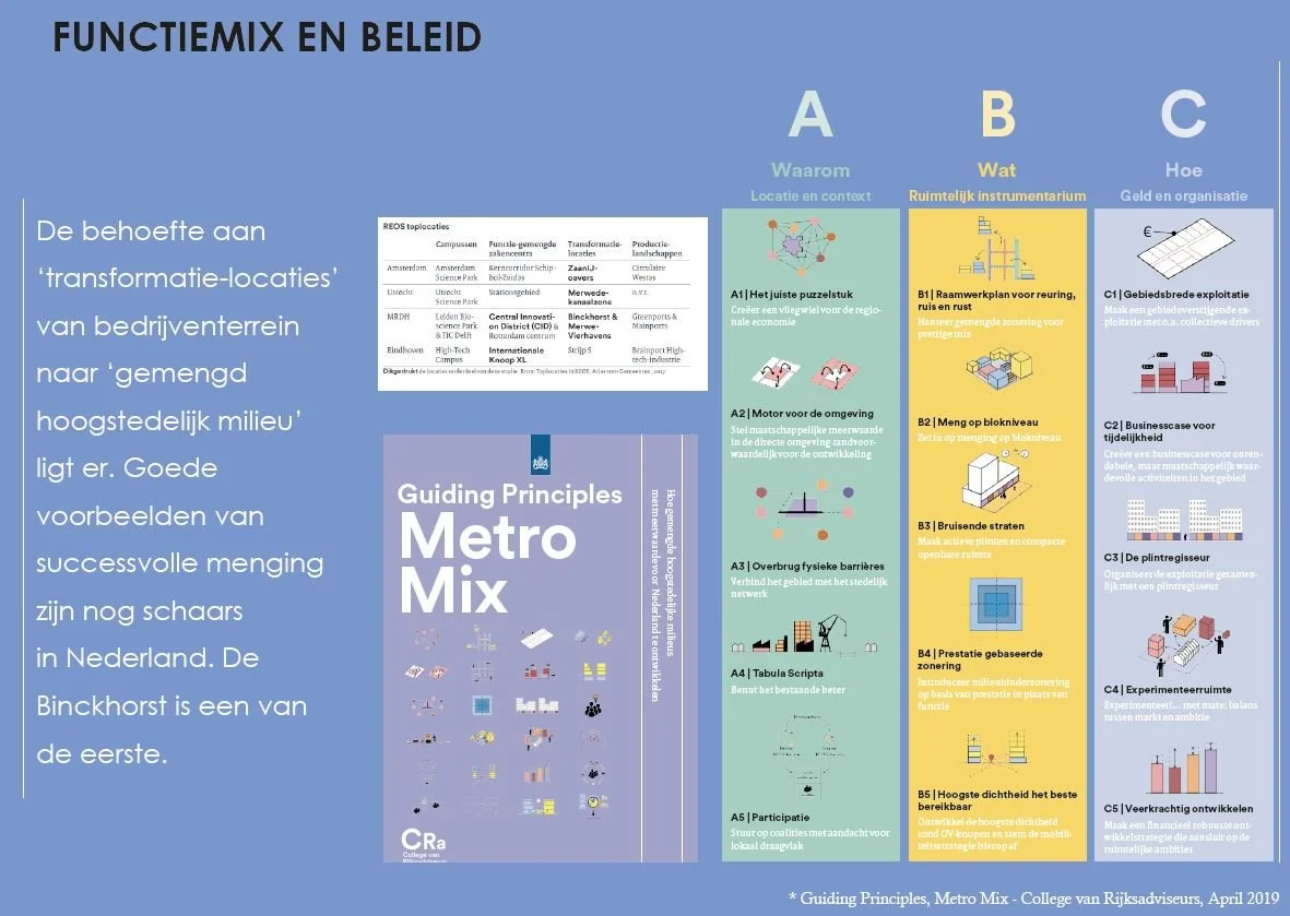 De aanleiding voor dit onderzoek is de transformatie van de Binckhorst naar een aantrekkelijk hoogstedelijk werkmilieu waarin ook woonfuncties geborgd moeten worden. Slimme functiemix is een interessant puzzelstuk in de gebiedstransformatie, maar functies mengen gaat niet vanzelf. In plaats van werkprogramma uit de binnenstad te drukken om plaats te maken voor woningen is er gelukkig een groeiende vraag naar een nieuw soort vestigingsklimaat.