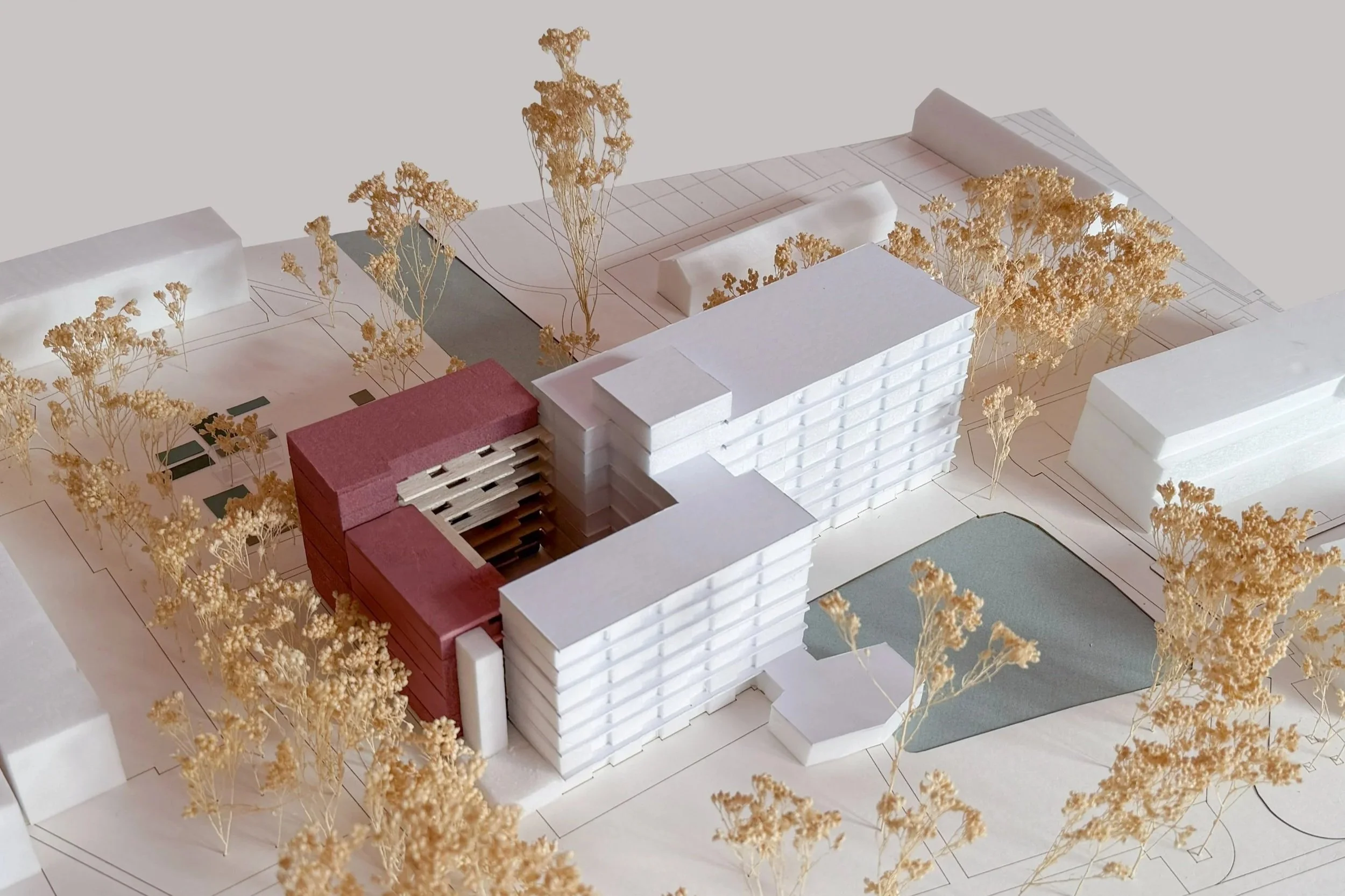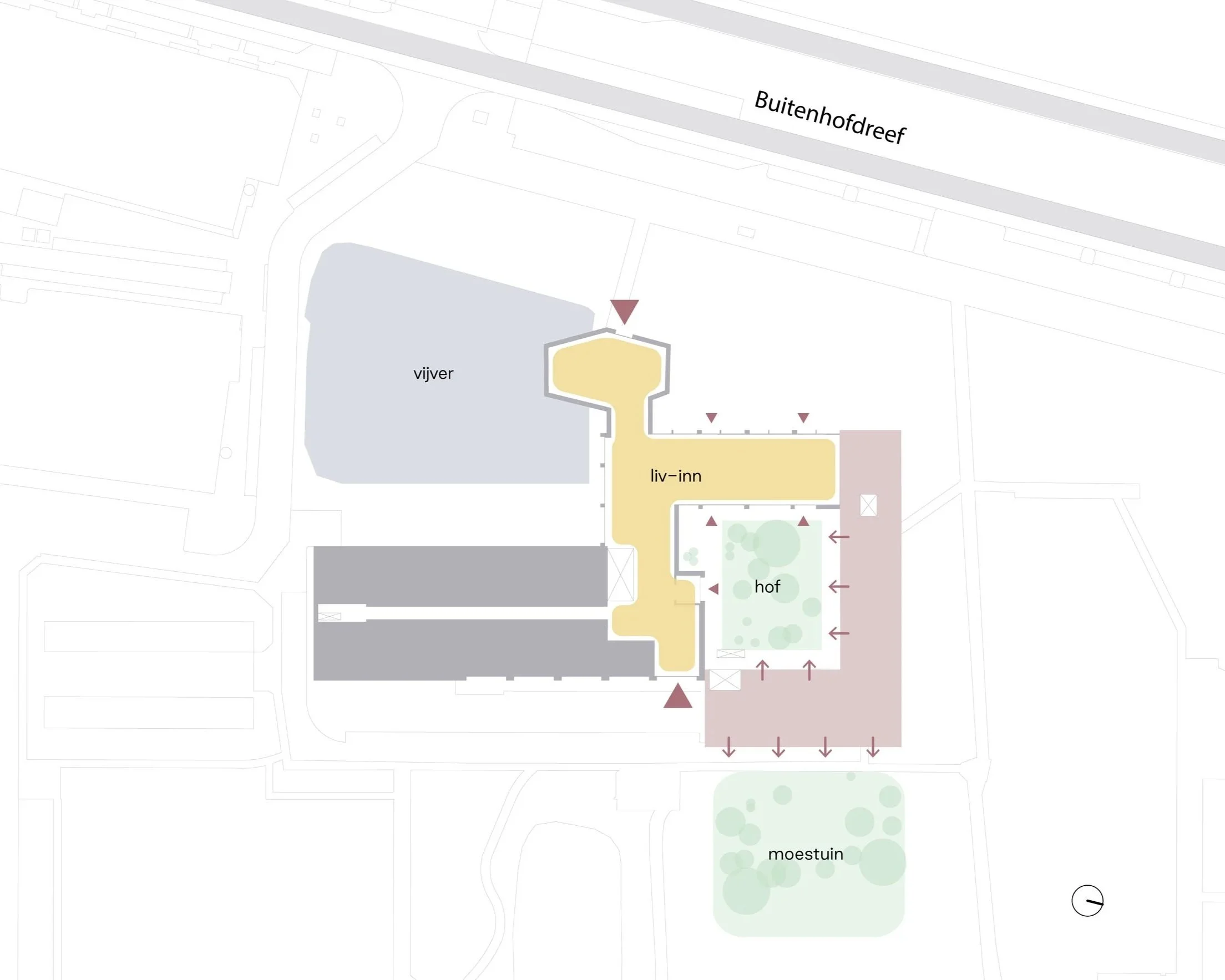 De Buitenhofdreef vormt één van de hoofdassen van de wijk en biedt kansen voor verdichting en kwaliteitsverbetering. De uitbreiding grijpt deze kans aan door de buitenruimte te activeren en de relatie tussen gebouw en straat te versterken. Door entrees aan de dreef te positioneren krijgt het gebouw een duidelijke voorkant en ontstaat er meer sociale interactie tussen bewoners en buurt.