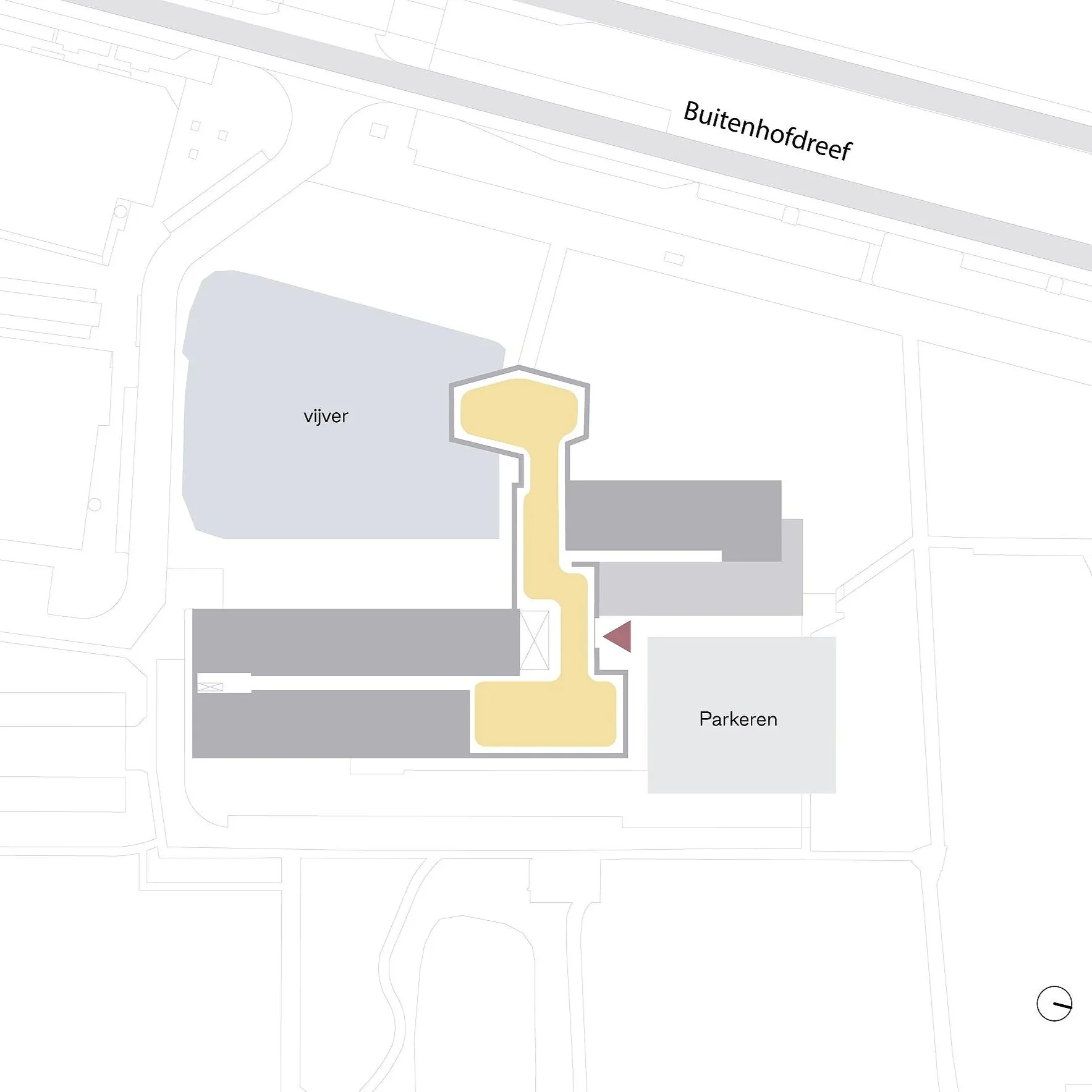 De Vijverhof ligt in de Buitenhof, een naoorlogse wijk met een orthogonale stedenbouwkundige structuur. Het groen is ruim aanwezig, maar heeft momenteel weinig betekenis als verblijfsplek.